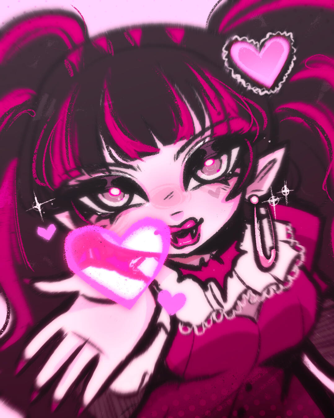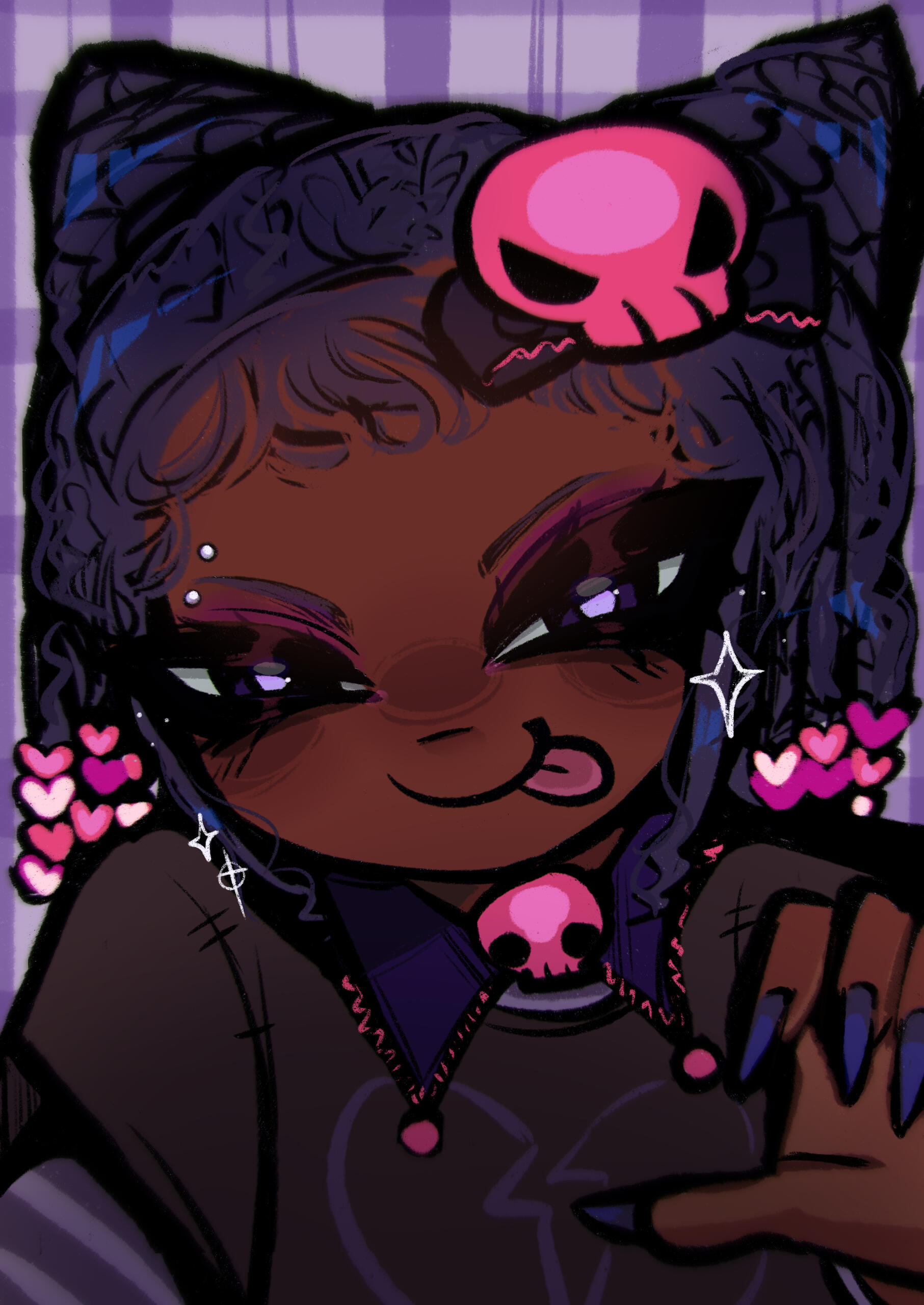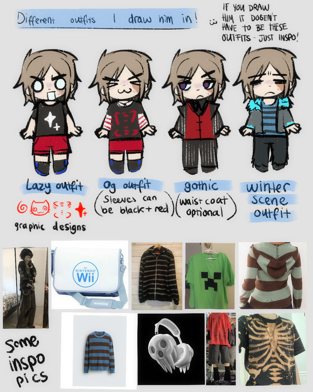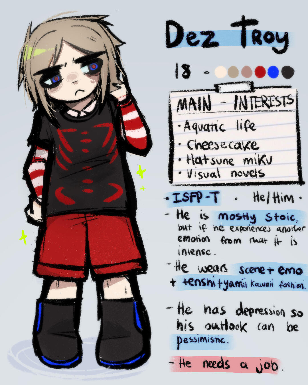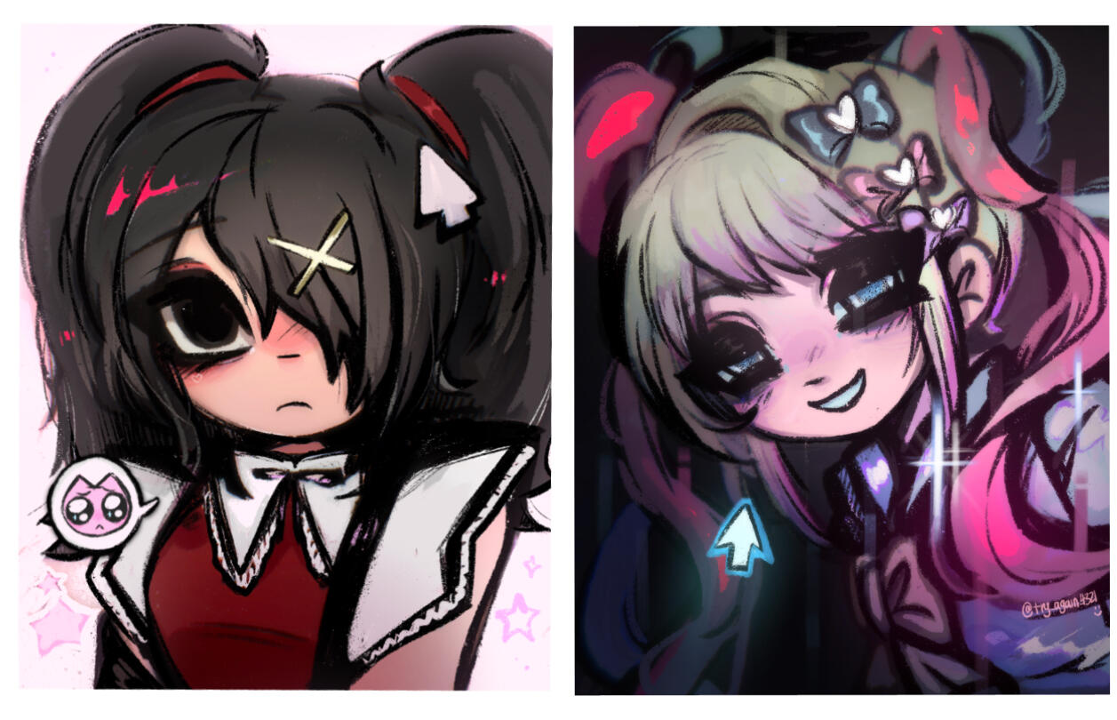 I like to draw my own characters and fanart! I focus a lot on emotions , tiles and water . Grunge and japanese fashions and subcultures inspire me a lot . One style I take a lot of inspiration from is yami kawaii , meaning “sickly cute” - i really like this style to express my mental health, so I feel my art is a good way to vent this out.